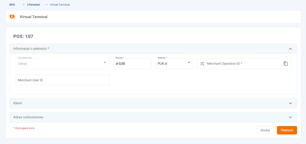 | Waluta | Obowiązkowy | Wybierz walutę skonfigurowaną dla terminala. |