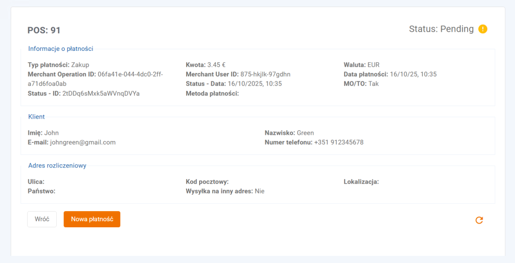 Na ekranie pojawi się podsumowanie, zawierające status płatności oraz wszystkie istotne szczegóły, w tym informacje o płatności, dane klienta oraz adresy rozliczeniowe i wysyłkowe.
