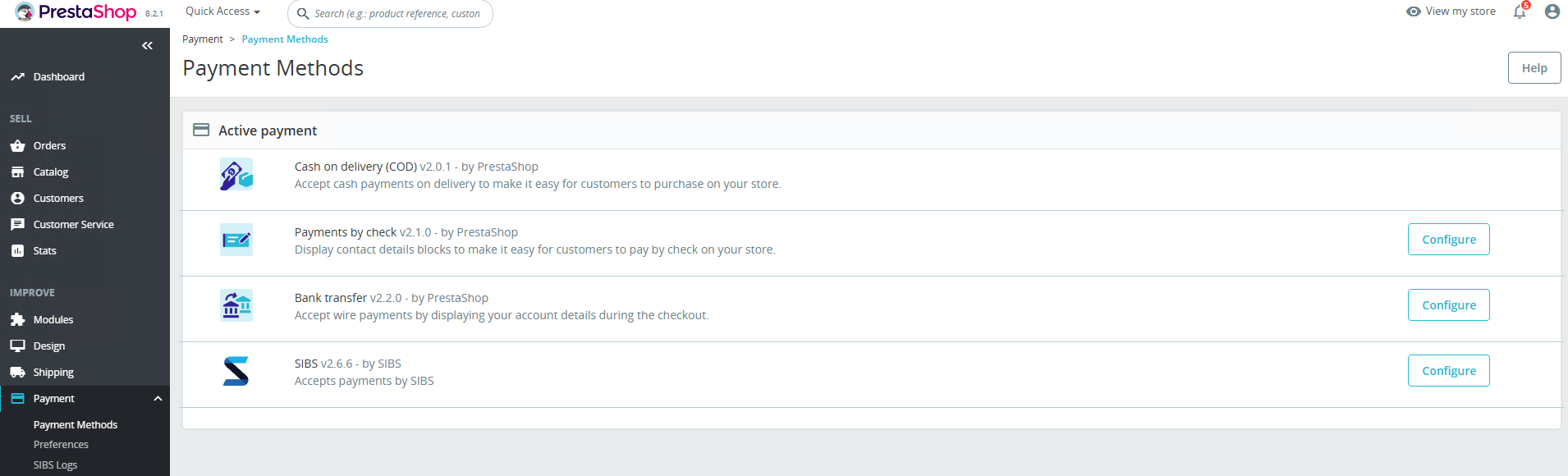 After scrolling to the payment modules section, you can find SIBS plugin. Press Configure to access the configuration page.