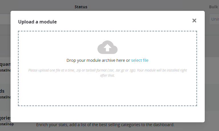 - Login at your Prestashop admin area (https://yourwebsite/myadmin/) at the sidebar menu. First go to Module Manager, there click Upload a module, and finally upload the .zip file provided at the onboarding process.